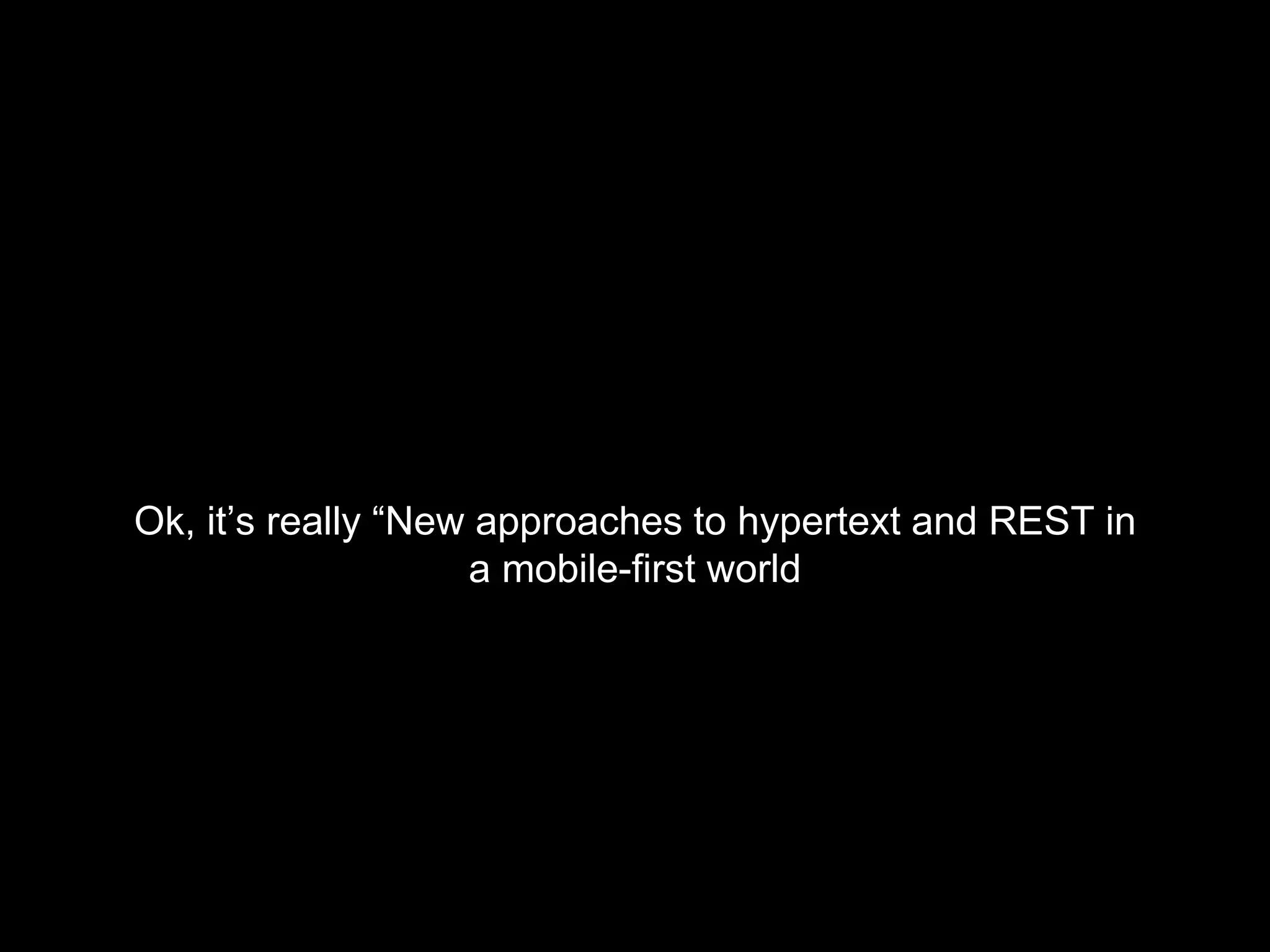 The document discusses new approaches to hypertext and REST APIs in a mobile-first world. It proposes using JSON Hyperschema to define self-describing APIs and objects that can be interpreted across different devices through custom components. This allows the backend to remain the same while the frontend is laid out differently for each client type, enabling data-centric design on the server and render-focused clients.