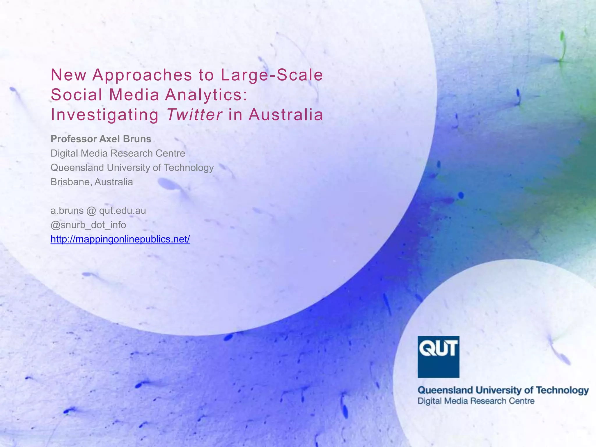 This document summarizes Professor Axel Bruns' research on analyzing large-scale social media data from Twitter in Australia. The research maps over 2.8 million identified Australian Twitter accounts and their follower/followee networks. It analyzes user engagement patterns around hashtags, news sites, and events. Tracking Australian Twitter activity over time provides a comprehensive dataset for understanding public discussions and responses to events in Australia.