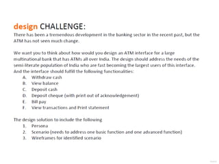 This document proposes two approaches - gradual improvement and radical improvement - for redesigning the ATM interface. The gradual approach would focus on iterative improvements to the existing card-based paradigm, while the radical approach introduces new interaction paradigms using technologies like facial recognition, voice commands, and gesture recognition. Three user personas are described representing illiterate, semi-literate, and physically challenged users. Scenarios showing voice-based interactions for withdrawing cash and depositing a cheque using the radical approach are then outlined. The radical approach aims to make ATMs more accessible and secure without needing plastic cards.