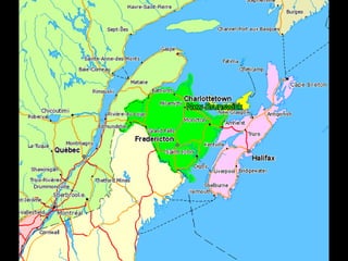 This document provides a list of locations in New Brunswick, Canada, including cities like Saint John and Edmunston, natural attractions like Hopewell Rocks and Wallace Falls, and landmarks such as Kings Square in Saint John and the Loyalist Burial Ground. It also mentions scenes from different areas and seasons in New Brunswick, such as morning fog over Hampton, autumn colors across marshes, winter sunsets, and coastal views along the St. John River.