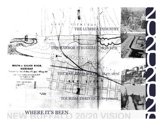 The document discusses the 'New Buffalo 20/20 Vision' plan, highlighting historical developments in the lumber and railroad industries, as well as the thriving tourism since 1900. It outlines assumptions for future growth, including a population increase and infrastructure improvements, while emphasizing the importance of integrating natural systems and historical context in development strategies. The vision includes specific land use frameworks and gateway projects aimed at enhancing community connections and visitor experiences.