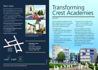 The government is investing £40 million to totally rebuild Crest Boys' Academy and Crest Girls' Academy. The new buildings will provide excellent facilities for students, staff, and the local community, including a library, theater, sports halls, and outdoor spaces. The document encourages local residents to provide input on the proposals at an upcoming consultation event on June 4th or online.