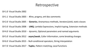 The document summarizes new features that have been added to C# programming language over different versions of Visual Studio. It discusses features such as generics, lambda expressions, LINQ, tuples, pattern matching, exception filters, auto-property initializers, expression-bodied members and more. It also provides code examples to illustrate some of these features like tuples, deconstruction, pattern matching with case statements, async Main method and others.