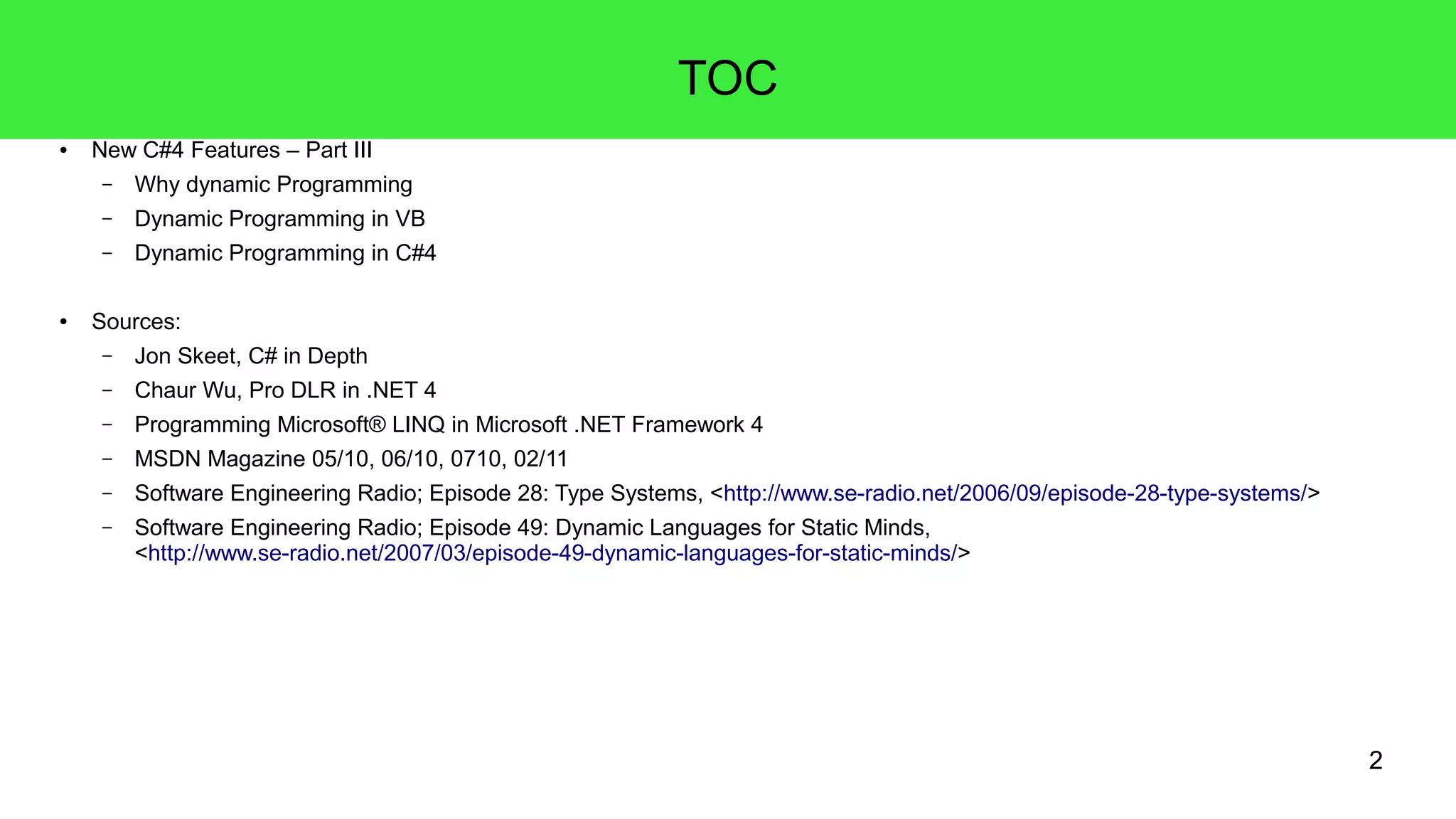 This document discusses new features related to dynamic programming in C# 4. It begins by explaining why dynamic typing is an important new feature in .NET 4 due to increasing needs for interoperability. It then provides an overview of dynamic typing concepts like late binding and duck typing. The document shows how these concepts are implemented in VB for dynamic programming and how C#4 introduces dynamic typing capabilities through the new "dynamic" keyword and Dynamic Language Runtime (DLR) while still being a statically typed language. It discusses the basic syntax for using dynamics in C#4 and some restrictions.