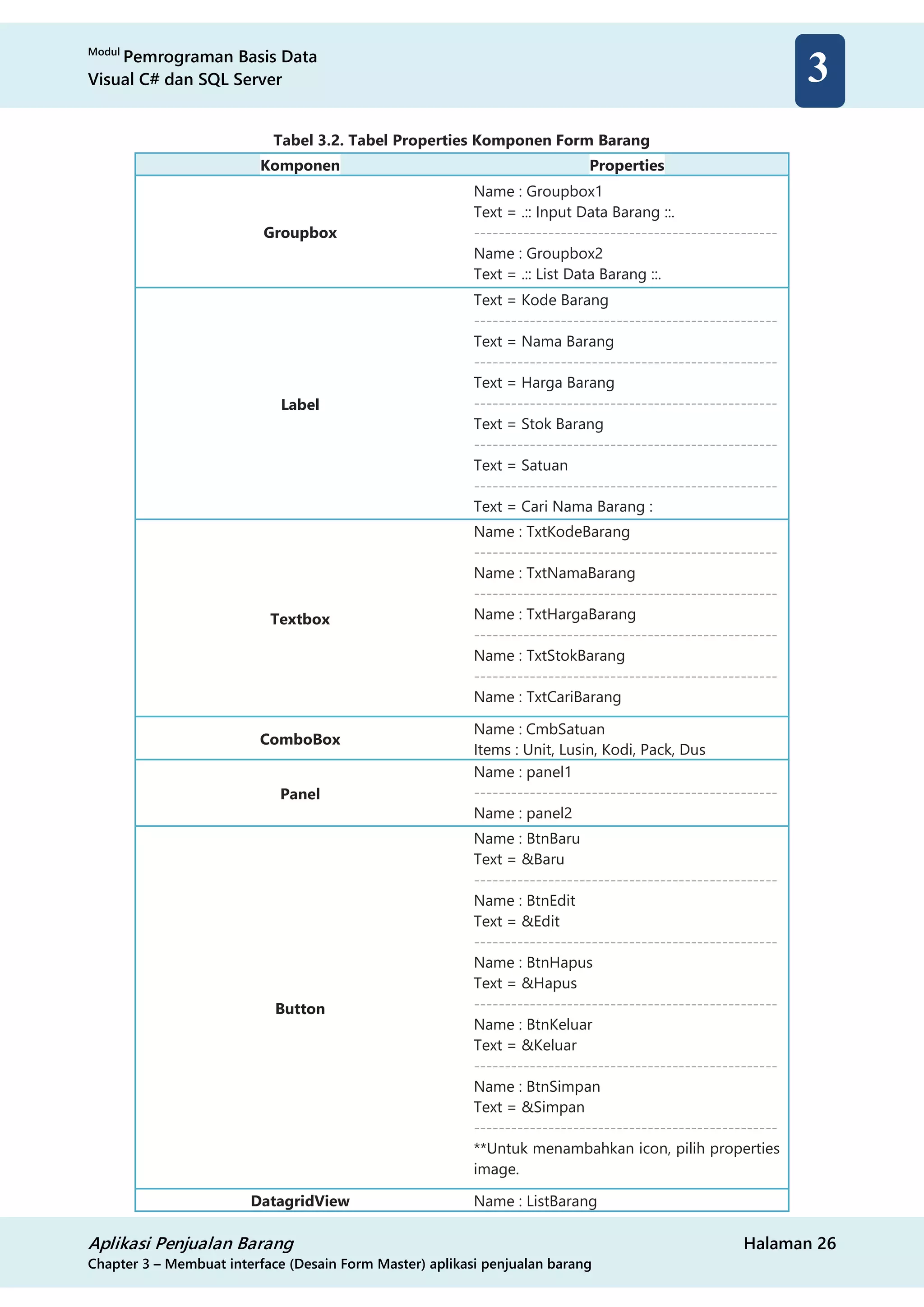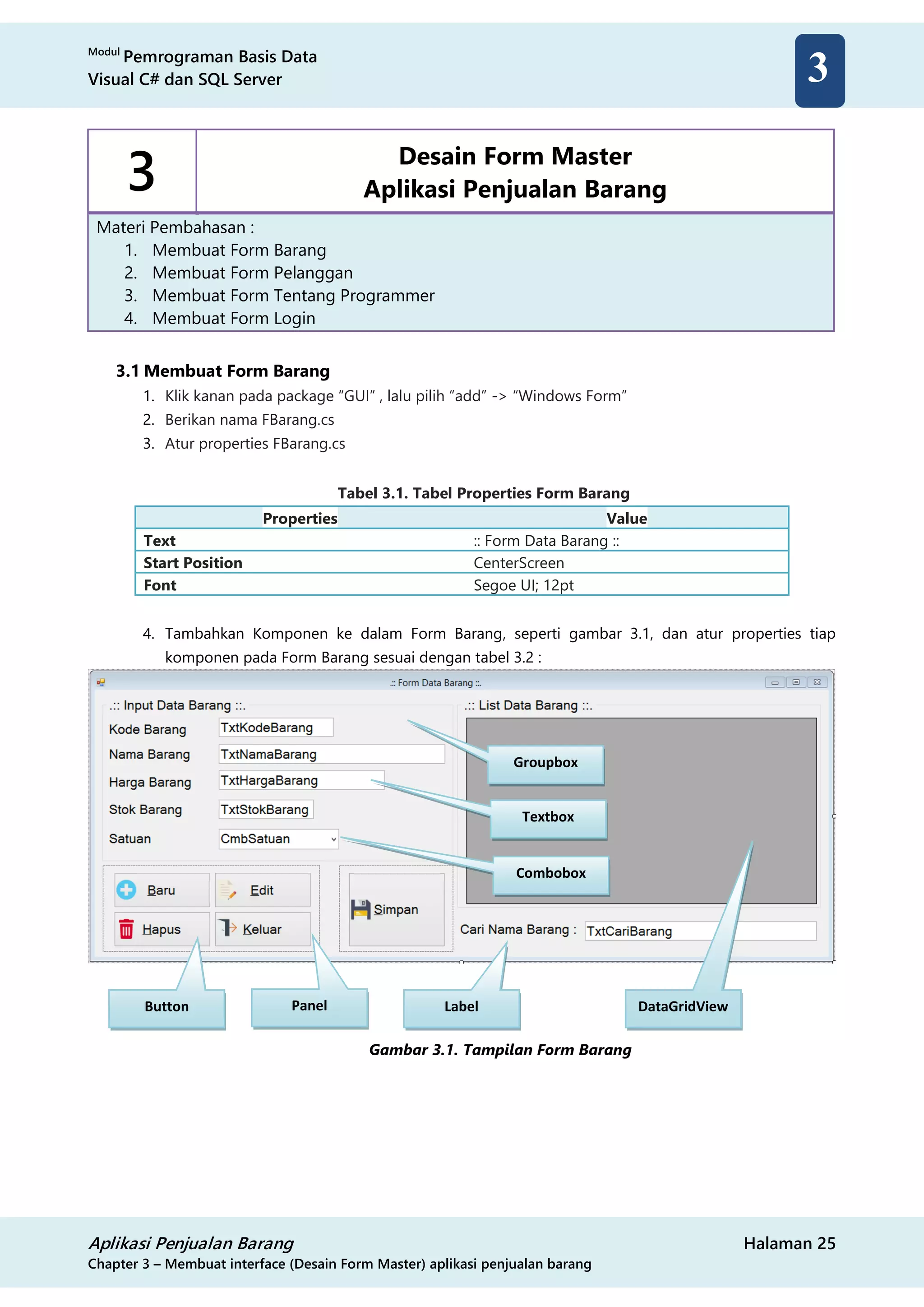 Dokumen ini menjelaskan langkah-langkah pembuatan antarmuka aplikasi penjualan barang menggunakan Visual C# dan SQL Server, termasuk pembuatan form barang, pelanggan, tentang programmer, dan login. Setiap form dilengkapi dengan detail properti komponen yang diperlukan, seperti groupbox, textbox, dan button, untuk mendukung fungsionalitas aplikasi. Panduan ini memberikan instruksi praktis dengan penataan komponen visual yang diatur secara spesifik.