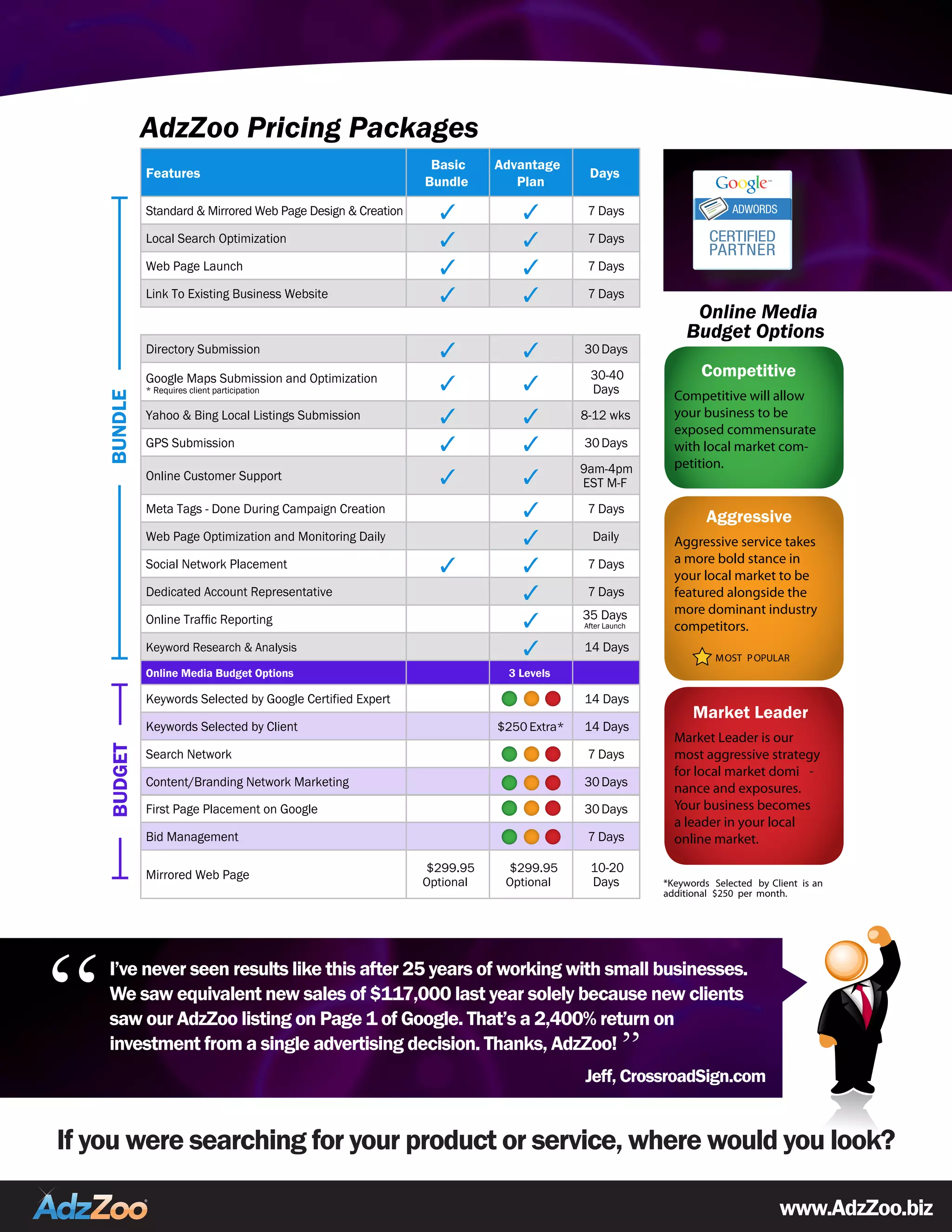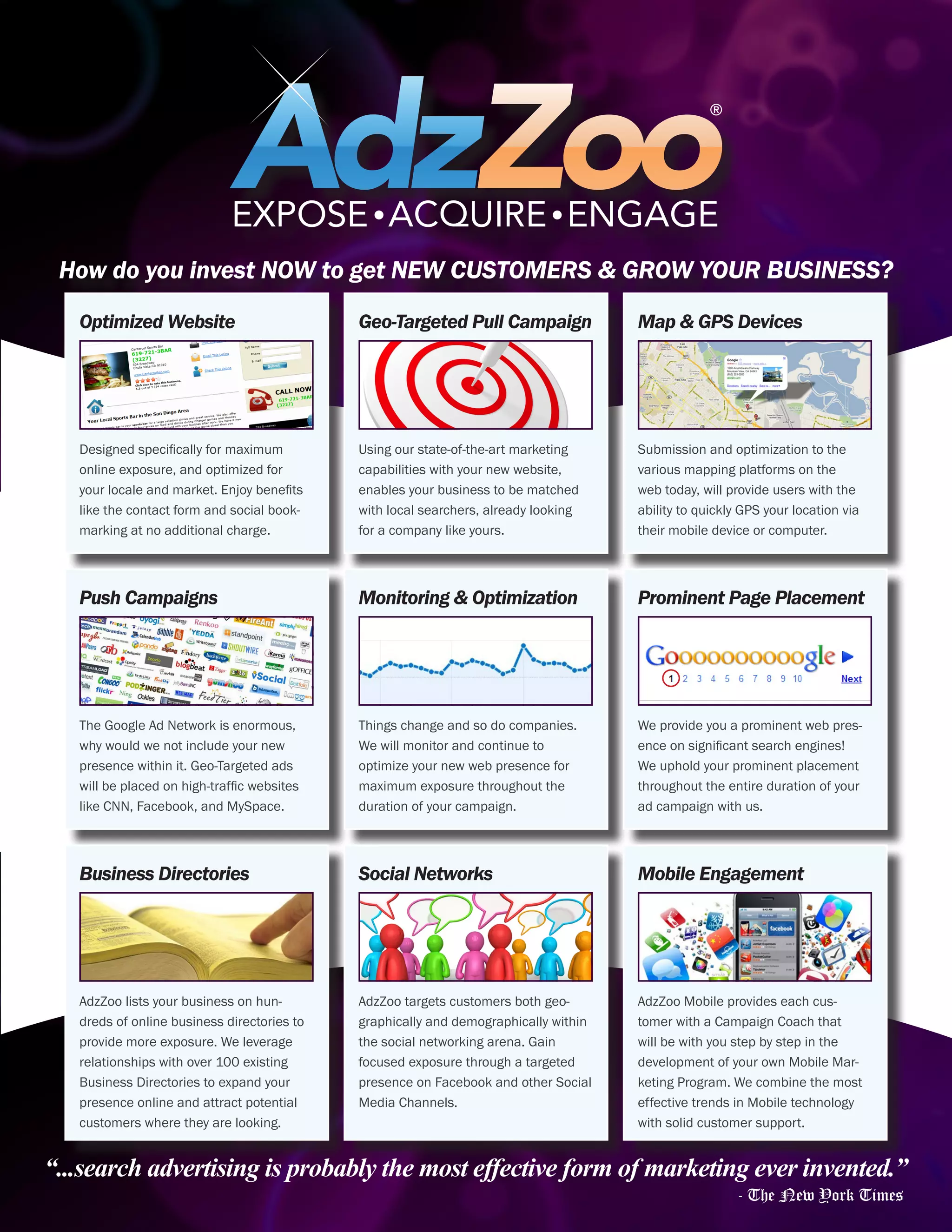 The document describes AdzZoo's online marketing services for growing a business and getting new customers. It outlines optimized website design, geo-targeted advertising campaigns, business directory listings, map submissions, and social media placement. Payment packages include basic and advantage plans starting at $299.95 per month, with options for selecting keywords, budget levels, and placement on Google's first page. Customer testimonials praise AdzZoo's results, including a 2,400% return on investment.