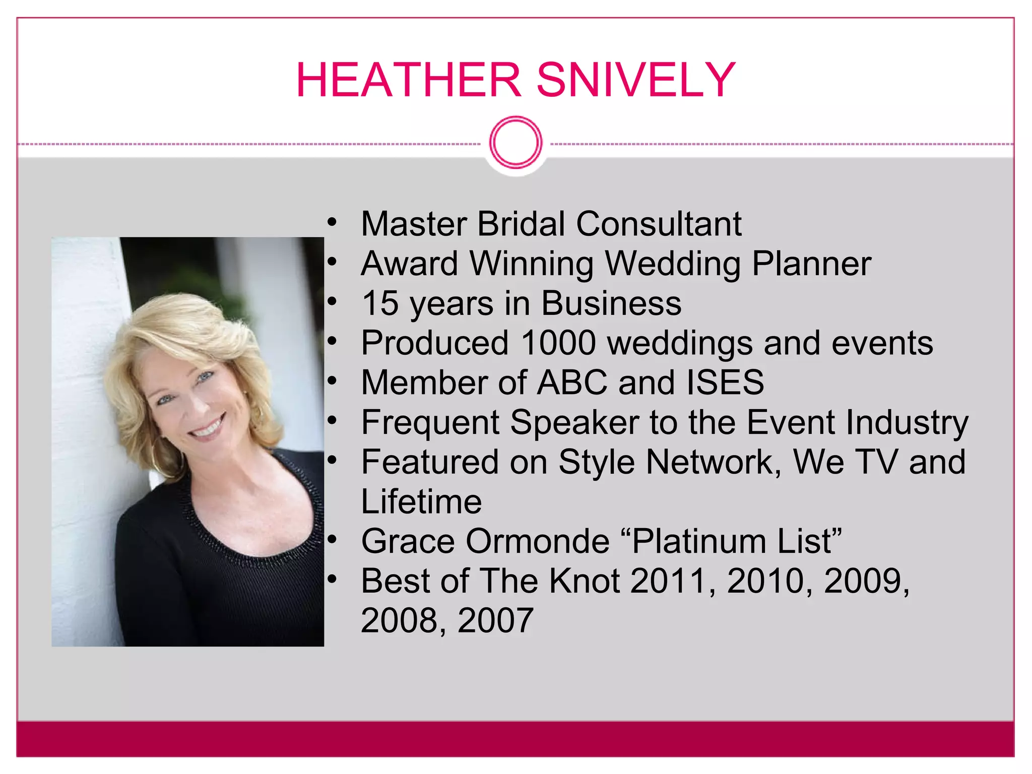 This document introduces Weddings Unique, a wedding planning company led by Heather Snively. It outlines their team of experienced wedding professionals, planning services, online planning tools, and packages for brides with varying levels of service needed. Their goal is to help brides create a uniquely styled wedding through creative planning and flawless execution.