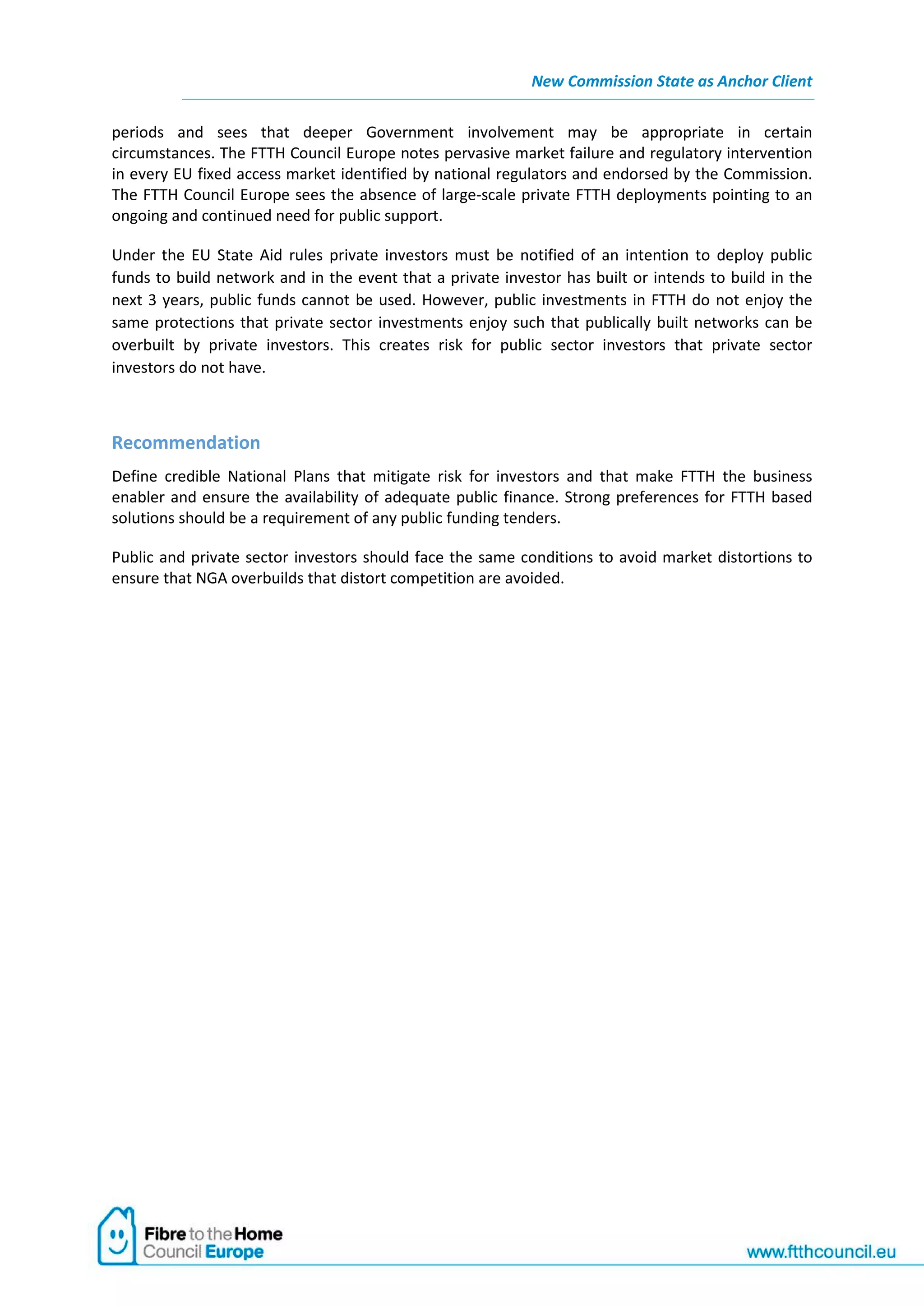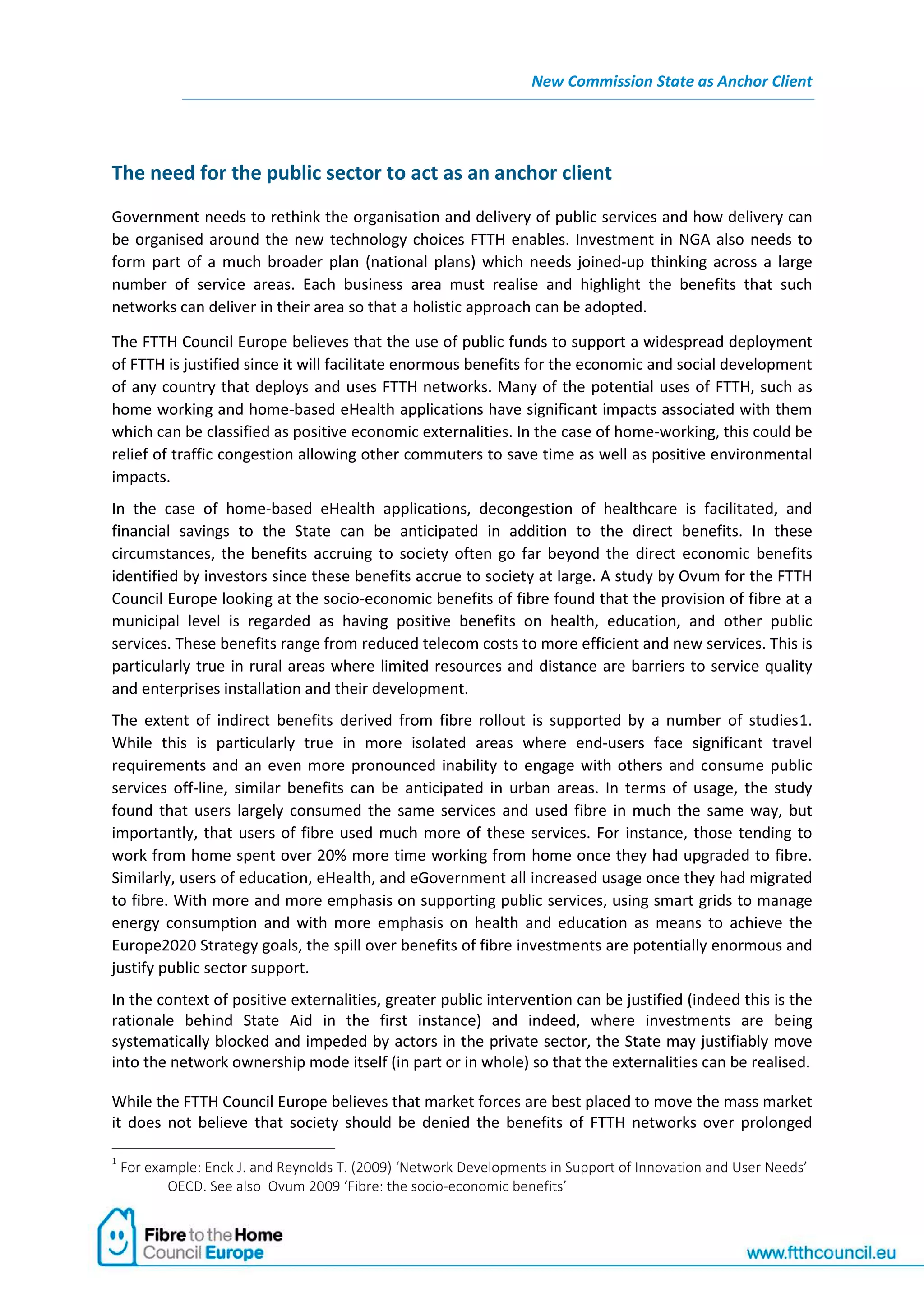 The document discusses the need for governments to act as anchor clients for fiber-to-the-home (FTTH) networks to facilitate widespread deployment and realize significant economic and social benefits. Public funding of FTTH networks is justified given benefits like remote work and telehealth that save costs and improve services. Studies show users increase their usage of broadband-enabled applications like education, healthcare, and government services over FTTH. The document recommends that governments define credible national plans to mitigate investor risk and make FTTH networks enablers of business, while ensuring public funding does not distort private investment.