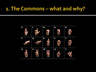 This document provides information about an upcoming course on commons research. It lists the class schedule, locations, and topics that will be covered. Requirements for the course include attending lectures, completing readings and summaries, writing a short essay on a commons-related topic, and participating in seminar discussions. The document provides guidance on assignments and access to course materials through the instructor's website. It also outlines the institutional, physical, educational, cultural and communicative contexts in which the commons aspects of the university environment will be examined.