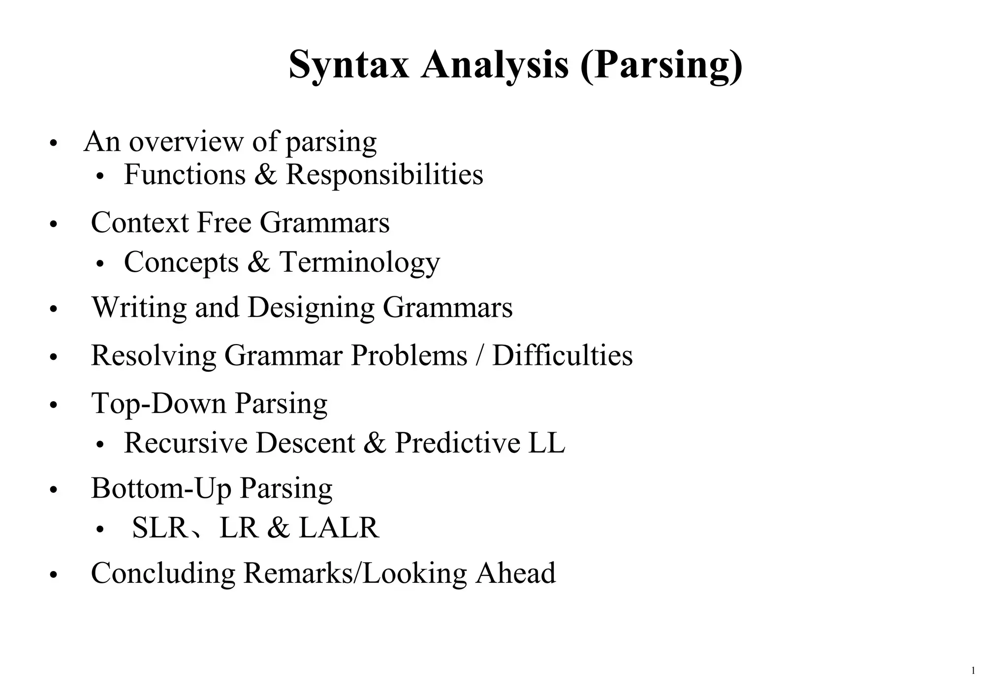 This document provides an overview of syntax analysis, also known as parsing. It discusses the functions and responsibilities of a parser, context-free grammars, concepts and terminology related to grammars, writing and designing grammars, resolving grammar problems, top-down and bottom-up parsing approaches, typical parser errors and recovery strategies. The document also reviews lexical analysis and context-free grammars as they relate to parsing during compilation.