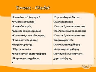 Η έννοια τηςεννοιολογικής χαρτογράφησης Η εννοιολογική χαρτογράφηση ( concept mapping ) σ υνιστά έναν από τους πιο γνωστούς τρόπους αναπαράστασης της γνώσης. Η έννοια αναπτύχθηκε από τον John Novak [ Novak, 1977, Novak & Gowin, 1984, Novak, 1990, Novak, 1998 ] με βάση τις ψυχολογικές απόψεις του [ Ausubel, 1978 ] και αφορά στην αναπαράσταση των εννοιών και των μεταξύ τους αλληλεξαρτήσεων με κόμβους και συνδέσεις, αντιπροσωπεύοντας γνωστικές δομές που οι άνθρωποι κατασκευάζουν στο μυαλό τους . Εντάσσεται στην επ οικοδομηστική προσέγγιση για τη μάθηση.