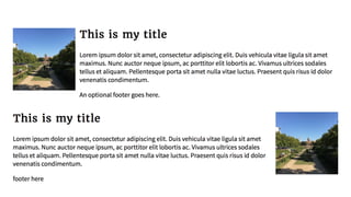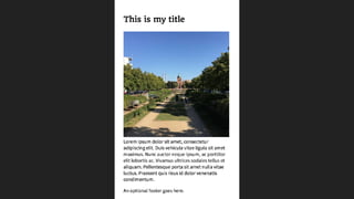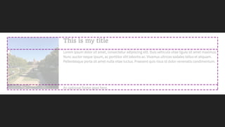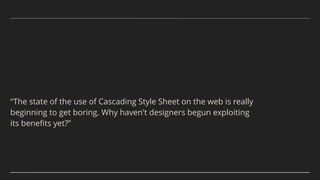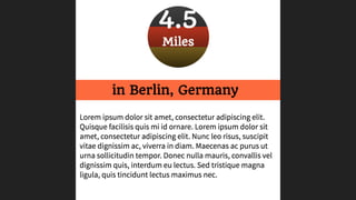 The document discusses using CSS grid layout to create magazine-style page layouts and fancy headers. It provides examples of creating a flexible "media object" with images and text that can stack on mobile. It also demonstrates making a "half-border box" and positioning elements in a "magazine-style layout" with multiple images and a caption. Finally, it shows how to style a run header with the distance in a circular shape and background image.