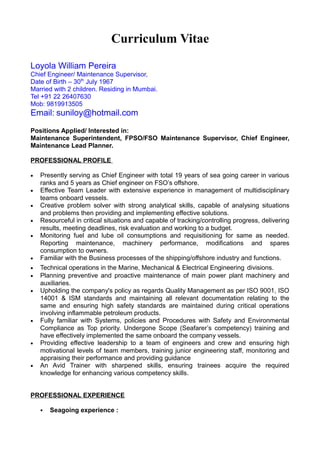 Loyola William Pereira is a Chief Engineer/Maintenance Supervisor with 19 years of experience working in various roles on vessels and offshore. He is currently seeking a position as a Maintenance Superintendent, FPSO/FSO Maintenance Supervisor, Chief Engineer or Maintenance Lead Planner. He has extensive experience leading teams and implementing safety and maintenance programs on various offshore vessels and rigs.