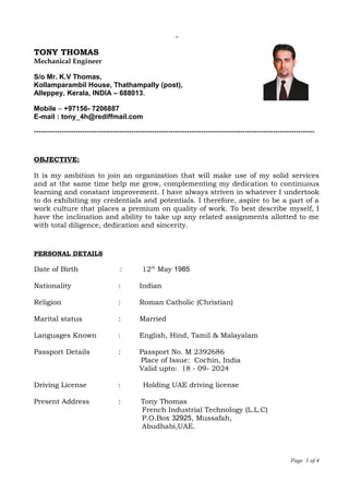 Tony Thomas is a mechanical engineer from India seeking a position that allows him to continuously learn and improve. He has over 7 years of experience in mechanical engineering and maintenance, including working as a service engineer and mechanical supervisor. His experience includes servicing valves, pumps, heat exchangers and other equipment for oil, gas and power companies in the UAE and Oman. He is proficient in AutoCAD and knowledgeable about maintenance codes.