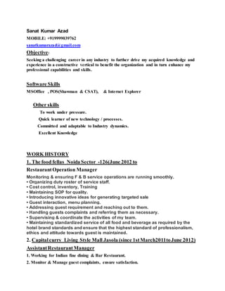 Sanat Kumar Azad is seeking a challenging career in the hospitality industry. He has over 15 years of experience in restaurant operations and management roles. He has worked in India and Dubai for hotels like Taj Residency, Royal Orchid, and Capital Curry. His skills include monitoring operations, managing staff, addressing customer complaints, and ensuring quality service standards. He is pursuing an MBA in Human Resources and holds a diploma in hotel management.