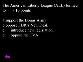 The document is a quiz about the New Deal programs and policies implemented during the Great Depression in the United States. It contains questions about specific New Deal agencies and initiatives like the Social Security Act, Works Progress Administration, and Tennessee Valley Authority. It also asks about opponents of the New Deal like the American Liberty League, and the political impacts and legacy of the New Deal programs.