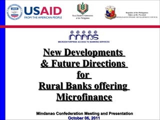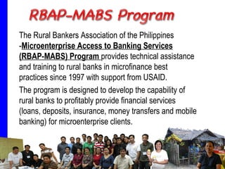 The Rural Bankers Association of the Philippines has been enhancing rural banks' microfinance capabilities since 1997 through the RBAP-MABS program, supported by USAID. As of September 2011, the program has assisted over 100 banks, facilitating significant growth in borrowers and loan disbursement across the Philippines. Future strategies focus on product innovation, geographic expansion, and partnerships to increase service reach and efficiency in the microfinance sector.
