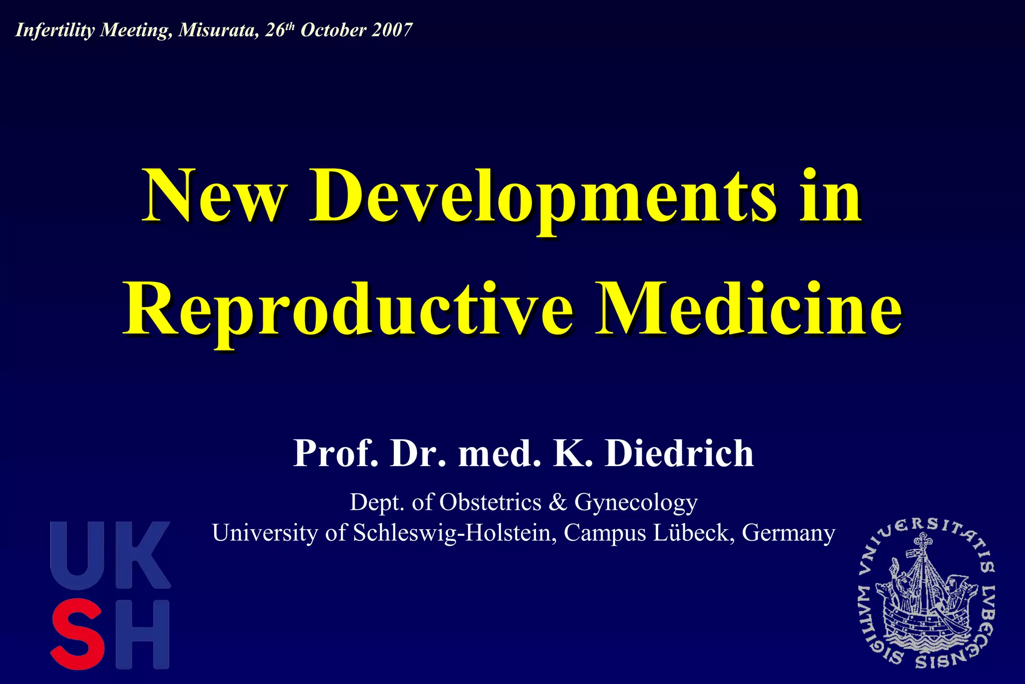 1. Approximately 15-20% of couples in Germany experience infertility issues. New developments in reproductive medicine include GnRH-antagonists for ovarian stimulation, elective single embryo transfer (eSET) to reduce multiple pregnancies, blastocyst culture, and vitrification for improved cryopreservation.