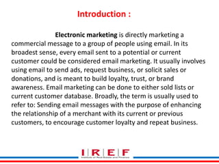 Electronic marketing is directly marketing a commercial message to a group of people using email. Email marketing can be done to either sold lists or current customer databases and usually involves using email to send ads, request business, or solicit sales or donations to build loyalty, trust, or brand awareness. Effective email marketing requires an attention-grabbing subject line that accurately conveys the purpose of the message in a few words and compelling content that encourages readers to open the email.