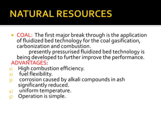 This document discusses various new and renewable energy technologies, including fluidized bed technologies for cleaner coal combustion, improved oil burner designs, transportation of natural gas via pipelines, and various non-conventional energy sources like solar, wind, biomass, biofuels, tidal, geothermal, and magneto-hydrodynamic technologies. Key advantages of fluidized bed coal combustion include high efficiency, fuel flexibility, and reduced corrosion. Solar and wind energy are abundant in many regions and can be harnessed through technologies like solar water heating, wind turbines, and energy plantations. Biomass, biofuels, and geothermal energy are also discussed as renewable sources.