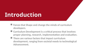 The document discusses various factors affecting curriculum development, including societal needs, technological advancements, political influences, and economic considerations. It emphasizes the importance of aligning curricula with multicultural values and global standards while integrating modern educational trends and sustainability topics. Examples from different educational systems, such as Finland and India, illustrate diverse approaches to fostering skills and innovation in learners.