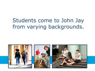 The document discusses the multifaceted aspects of student life at John Jay College, highlighting the diverse backgrounds of students and the critical factors influencing their engagement and retention. Several strategies for supporting student success are identified, including setting high expectations, providing clear advice, and fostering involvement and learning. It emphasizes the importance of holistic support services and active faculty-student engagement to enhance retention and academic outcomes.