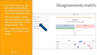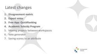 The document outlines several new features, including a disagreement metric for survey questions, an export function for votes, and a free app called QuickRanking for quick decision-making. It also mentions an academic subsidy program for reduced software access, project migration between workspaces for enterprise users, and vote generation for demo purposes. Additionally, it introduces functionality to save scores to attributes for better analysis in enterprise projects.