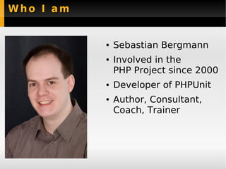 This document provides an overview of PHPUnit, a unit testing framework for PHP. It introduces Sebastian Bergmann, the creator of PHPUnit, and describes some of PHPUnit's key features like test frameworks, integration with other tools, code coverage, and more. Examples are provided of writing unit tests with PHPUnit using the PHPUnit_Framework_TestCase class. Additional features like annotations, data providers, exceptions, groups, and behavior-driven development styles are also demonstrated.