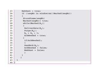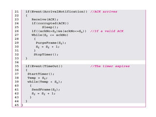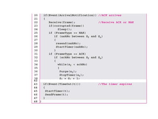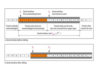 Data link control involves framing data, flow and error control, and common protocols like HDLC and PPP. Framing involves adding source/destination addresses to frames for transmission. Flow control restricts how much data the sender sends before waiting for acknowledgment. Error control uses techniques like automatic repeat request to retransmit lost data frames. HDLC and PPP are protocols that define frame formats and control procedures for point-to-point links.