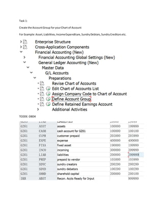 1. Creating account groups like assets, liabilities, income, and expense accounts.