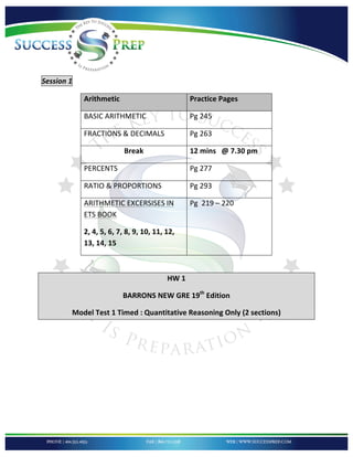 This document outlines a study plan for GRE preparation. It includes 4 sessions focused on different GRE verbal topics: analytical writing, reading comprehension, text completions and sentence equivalence questions, and vocabulary building. Each session provides an overview of the topic, strategies for answering different types of questions, and examples of vocabulary words to learn. Practice pages and homework assignments involving timed practice tests are included to help prepare for the actual GRE.