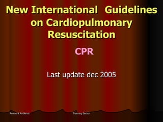 The document summarizes new international guidelines on cardiopulmonary resuscitation (CPR) from 2005. It discusses the importance of early CPR, the proper techniques for CPR including chest compressions and ventilations. It provides guidance on CPR protocols for adults, children, and infants. It also outlines the role of defibrillators in reviving someone in ventricular fibrillation and the proper use of automated external defibrillators.