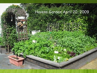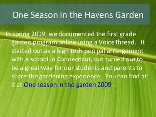 The document summarizes the history and goals of the school garden program at Havens School. It provides details about the original garden layout and curriculum standards it supported. The new school construction plans reduced garden space, so alternative layouts are proposed to continue supporting the first grade garden curriculum, though additional space would be needed for other grades. School staff are committed to the garden program and designing raised beds to maximize the available space.