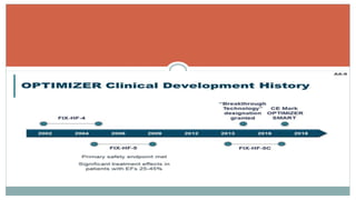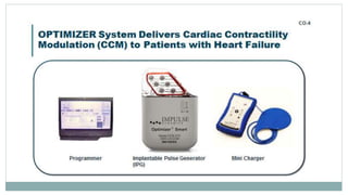His bundle pacing is an innovative therapy for heart failure that activates the ventricles via the natural conduction system, providing advantages over traditional biventricular pacing, including improved QRS duration and restored intrinsic activation patterns. This technique may benefit patients with left bundle branch block and those with narrow QRS durations while preventing pacing-induced cardiomyopathy. The document also discusses cardiac contractility modulation, a device-based therapy for heart failure that enhances myocardial function without increasing oxygen consumption.
