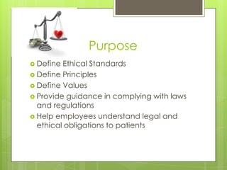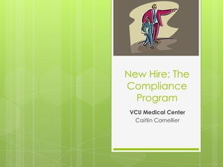 The document provides an overview of the compliance program for new hires at VCU Medical Center. It defines the program's purpose as establishing ethical standards, principles, and values to guide employees in complying with laws and regulations, and caring for patients. The code of ethics, principles, and values that employees must uphold are described. Employees' basic responsibilities under HIPAA regarding protecting patient privacy and health information are outlined. Violations of HIPAA rules and safeguards for privacy are also summarized.