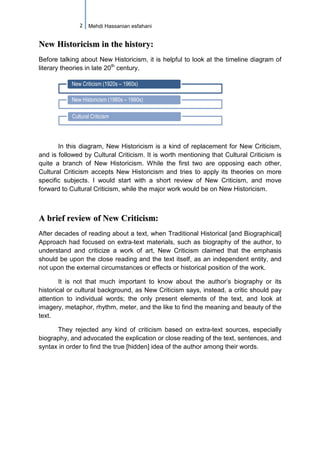 1. The document discusses New Historicism, a literary theory that emerged in the 1980s in response to New Criticism. 2. New Historicism views history as a narrative shaped by subjective biases rather than objective facts, and believes literary texts should be understood within their social and cultural contexts rather than in isolation. 3. Prominent figures associated with New Historicism mentioned include Stephen Greenblatt and Hippolyte Adolphe Taine. New Historicism tends to examine popular works and marginalized groups to uncover neglected historical voices.