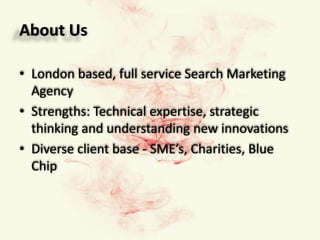 This document discusses four innovations in search engine optimization: 1) social media and its impact on SEO through link building and capturing long tail traffic; 2) real-time search and the opportunity it provides for brands to monitor conversations; 3) mobile search and the opportunity it presents as mobile traffic grows faster than desktop and smartphones surpass PC sales; 4) the convergence of web search and TV through platforms like Google TV and the opportunity it provides for mass market reach.