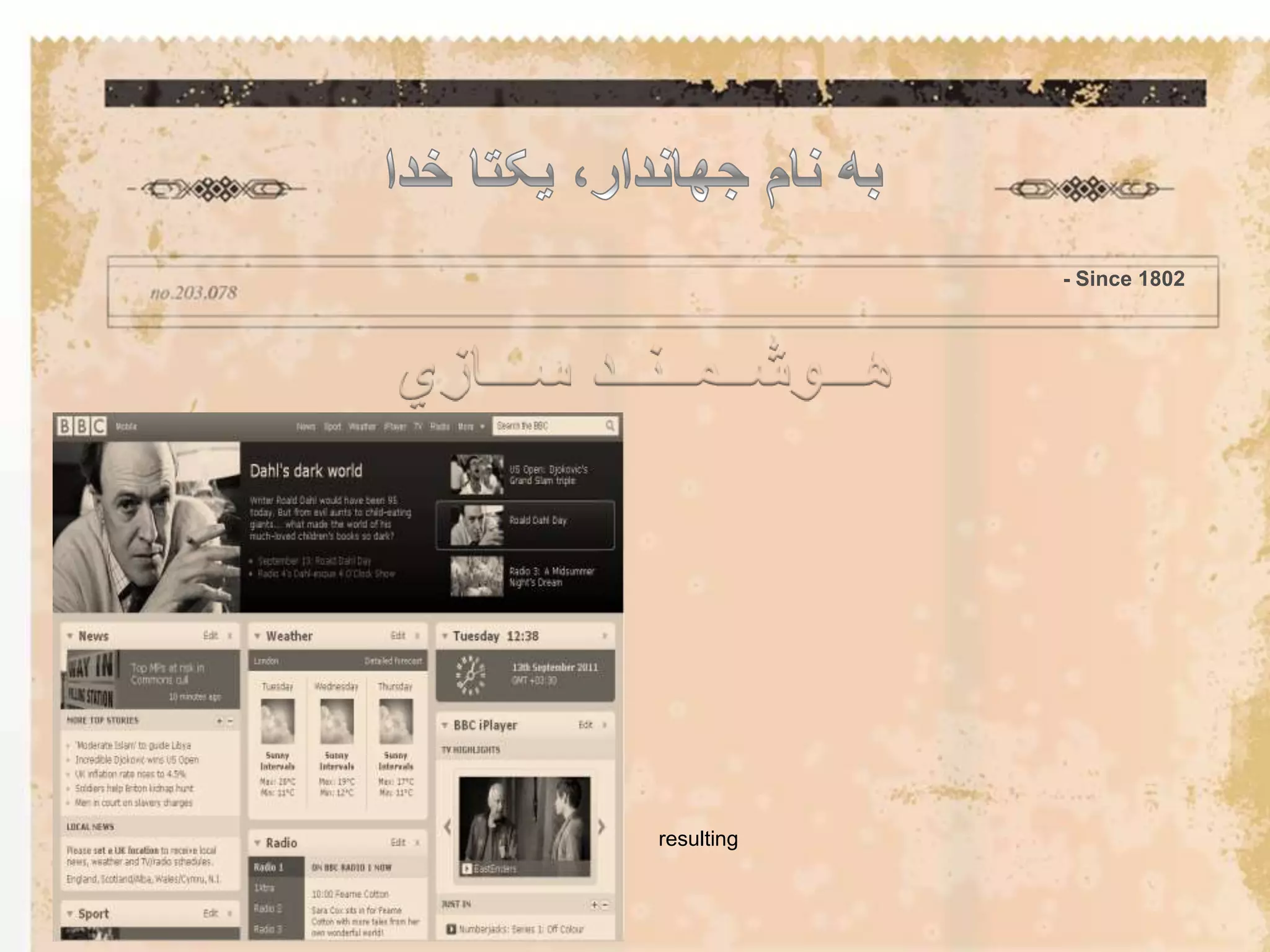 #4 30سال نفر در زمينههاي :فنآوري؛رسانه؛نرم افزار؛خوانده شدندمانيفست بي بي سي؛مانيفست موزيلا؛كتاب هنر رهبري و جنگ؛كتاب هنر جنگ سان تسومعرفيتنها راه تعالي،تحول فنآوري ؛ملاحظات كاستي ها؛رسيدن به سطح جهاني ؛دانايي ؛مجموعهای به نام هوشمندسازي ؛فرجام كاردرون مايه هايجاد توانمندي در افراد ؛بهرمندي از تمام ظرفيت فنآوری و خلق فنآوریهای نو ؛اطلاعات سرمايهاي گرانبها؛ساماندهي اطلاعات؛تمام سازمان در يك اتاق؛بهره مندي از ابزارها و ابزاركها؛تجاري سازي محصولماموريتمامویت ما ايجاد تحول در سازمان موجود و تبديل آن به يك سازمان دانا خواهد بود.
