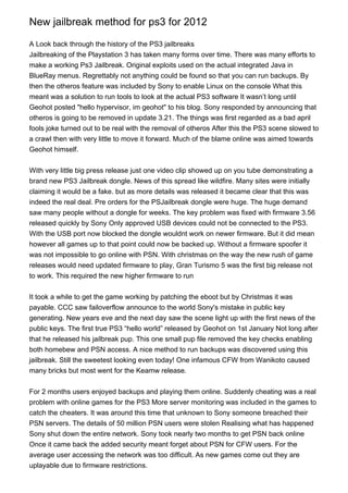 A new PS3 jailbreak dongle was released, enabling users to backup games and play them without updating firmware. However, Sony quickly responded by blocking unauthorized USB devices with firmware 3.56. This stopped the dongle from working on newer systems. Another jailbreak was released on New Year's Eve 2011 using Sony's mistake in public key generation. This allowed homebrew and PSN access until cheating online led to tighter security and the temporary shutdown of PSN in 2011. The scene has continued with other dongles and jailbreaks aiming to retain game backups and PSN access.