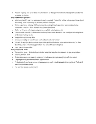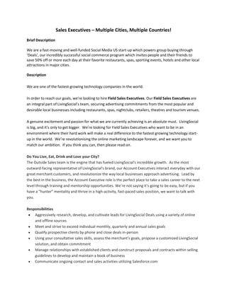 This document describes sales executive positions at a fast-growing social media startup that offers group buying deals through their deals program. The roles involve securing advertising commitments from local businesses in multiple cities and countries. Responsibilities include aggressively pursuing leads, meeting sales goals, qualifying and closing deals with clients, and managing an existing book of business using Salesforce. Successful candidates will have a minimum of two years sales experience, be passionate about online advertising sales, and thrive in a fast-paced environment. Compensation includes a competitive base salary plus unlimited commission potential.