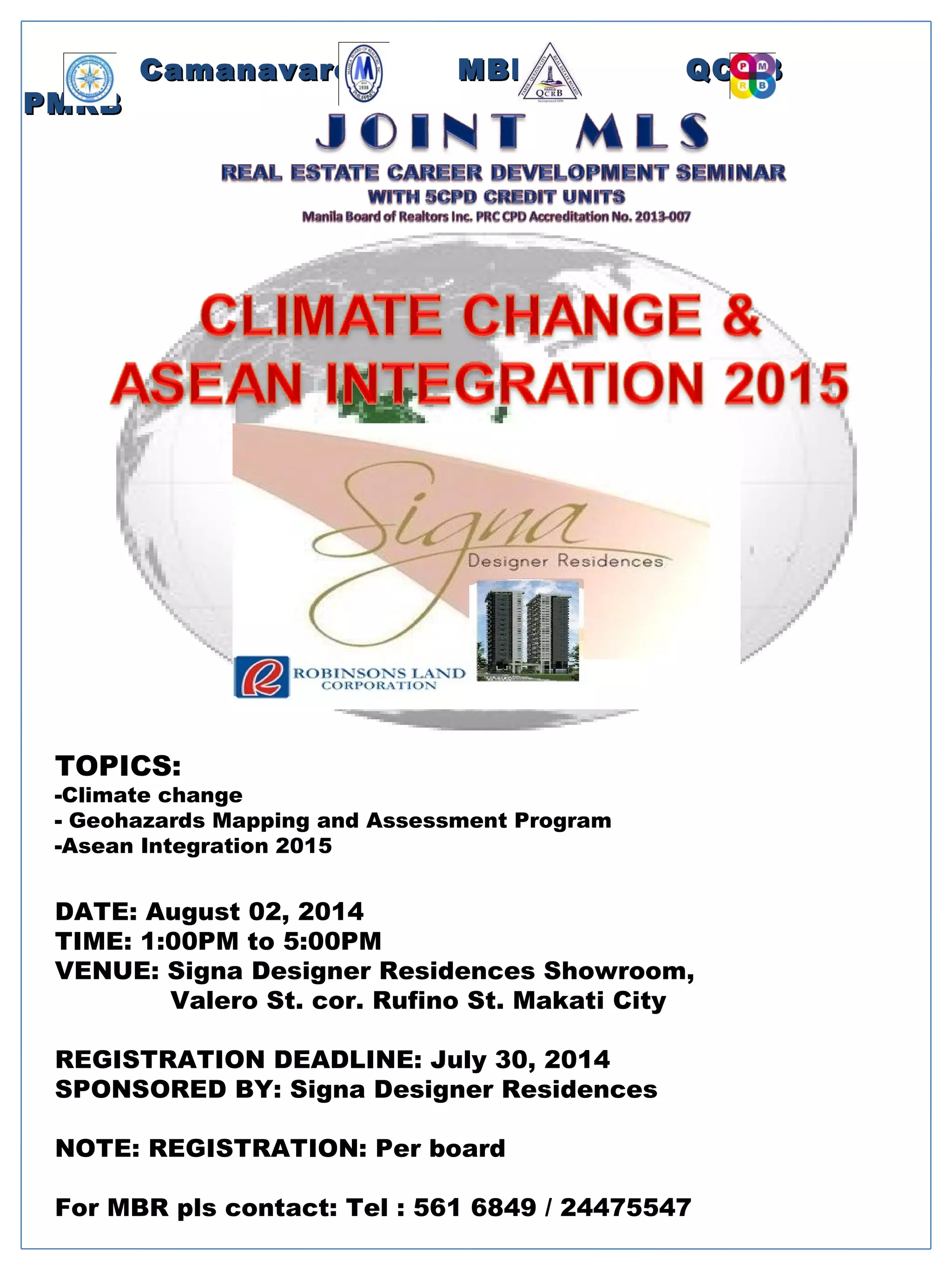 The document announces a training event on climate change, geohazards mapping, and ASEAN integration from 1-5 PM on August 2, 2014 at the Signa Designer Residences Showroom in Makati City. Registration is required by July 30th and is available per board. Those interested in attending under the MBR program should contact the phone numbers provided.
