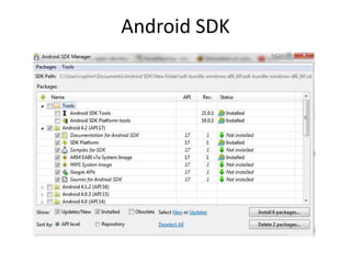 The document discusses installing the Android SDK and launching an Android virtual device (AVD) in Eclipse. It covers naming an AVD, continuing the installation process, and selecting and launching the AVD.