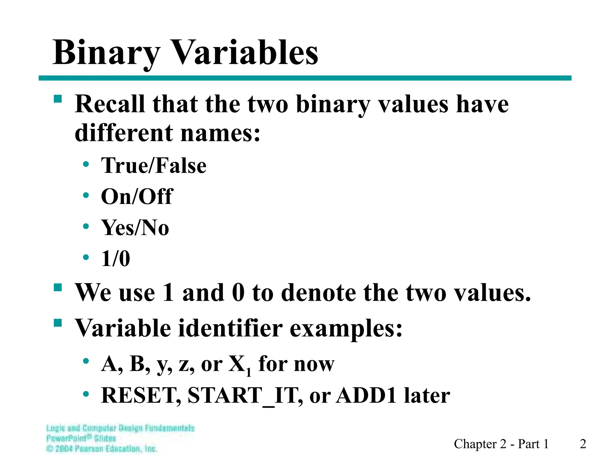 Chapter 2 introduces binary logic and gates, explaining binary variables, logical operators (AND, OR, NOT), and their notation. It also covers truth tables, the historical evolution of logic gates from relays to transistors, and how to represent logic functions using Boolean algebra. The chapter emphasizes the importance of these concepts in designing and analyzing digital systems.