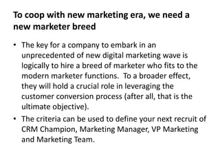 The book 'Inbound Marketing, Revised and Updated' by Brian Halligan and Dharmesh Shah emphasizes the necessity of a new breed of digital marketers who can effectively attract, engage, and delight customers online. It introduces the D-A-R-C criteria for hiring, which focuses on recruiting digital citizens, individuals with analytical skills, those with a strong web reach, and creative content creators. Companies must adapt by hiring marketers who are engaged and knowledgeable about digital marketing trends, or risk losing their competitive edge.