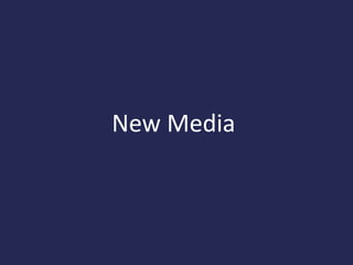 New media refers to digital technologies and content distributed through the internet. This includes websites, mobile apps, social media, and multimedia. The history of new media began in the 1950s with connections between computing and art. In the 1990s, the internet transformed media through technologies like online video and social media. Popular forms of new media today include Facebook, Twitter, YouTube, WhatsApp, Instagram, and Snapchat, which people use to share content, communicate, and advertise businesses. While new media provides benefits like entertainment and sharing news, it also poses risks like addiction, privacy issues, and spreading of misinformation if not used carefully.