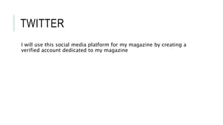 Twitter is a social media platform that can be used to promote magazines. The author plans to create a verified Twitter account dedicated to their magazine to utilize the platform. This Twitter account will help spread information about the magazine to followers.