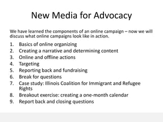 The document outlines a two-day training on online advocacy for immigration reform, focusing on the essentials of online campaign strategy. It covers topics such as online organizing, narrative creation, engagement tactics, and the importance of connecting online and offline efforts. A case study on the Illinois Coalition for Immigrant and Refugee Rights is included, along with practical exercises for participants to develop their own advocacy calendars.