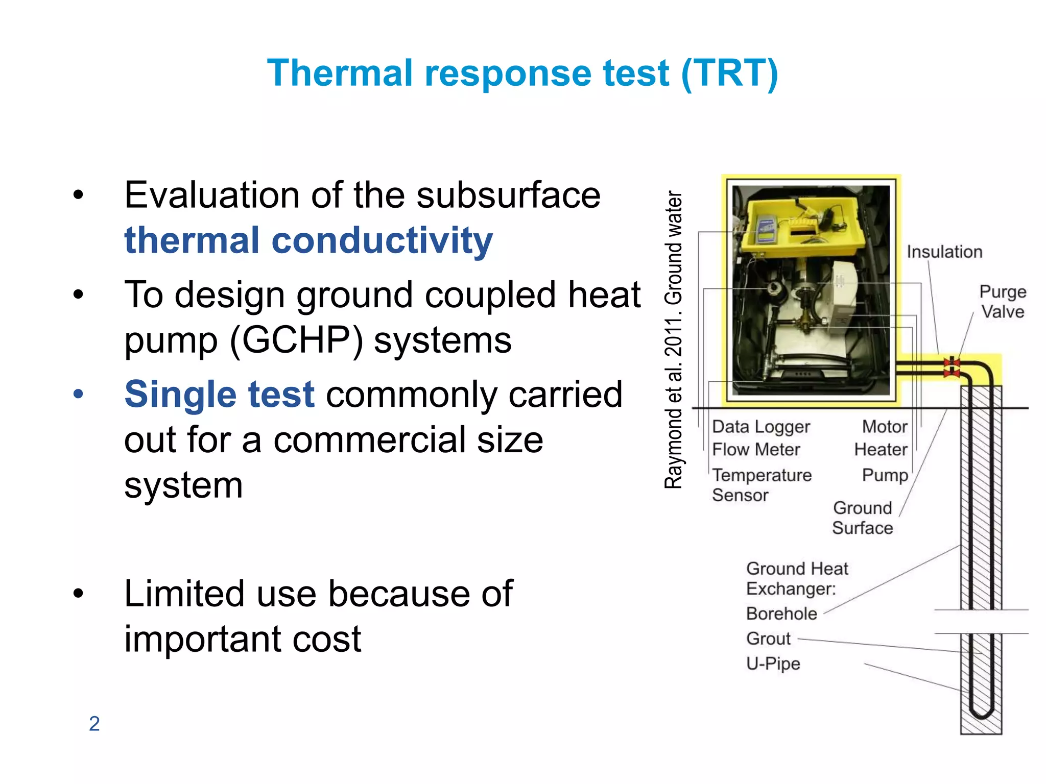 This document describes two new methods for spatially extending thermal response test (TRT) assessments: 1) Inverse numerical modeling of temperature profiles from multiple boreholes at a site can be used to evaluate subsurface thermal conductivity beyond a single TRT well. 2) At a district scale, geostatistical simulation using thermal conductivity data from outcrops, boreholes, and multiple TRTs can provide stochastic realizations of subsurface properties to spatially interpolate between test locations. Both methods allow TRT assessments to be expanded beyond their typical limited spatial scope, creating new opportunities for evaluating ground source heat potential.