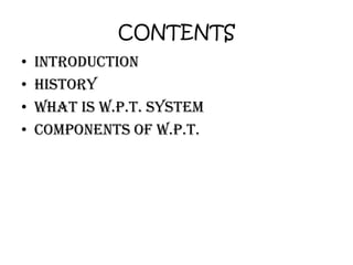 This document discusses wireless power transmission (WPT) as an alternative to traditional wired power transmission systems. It provides background on Nikola Tesla's early experiments with wireless power in the late 19th century. The key components of a WPT system are described, including a microwave generator, transmitting antenna, and rectenna that converts received microwaves to DC power. Advantages include higher efficiency and lower losses compared to wired systems, while disadvantages are higher installation costs and potential interference with communication systems.