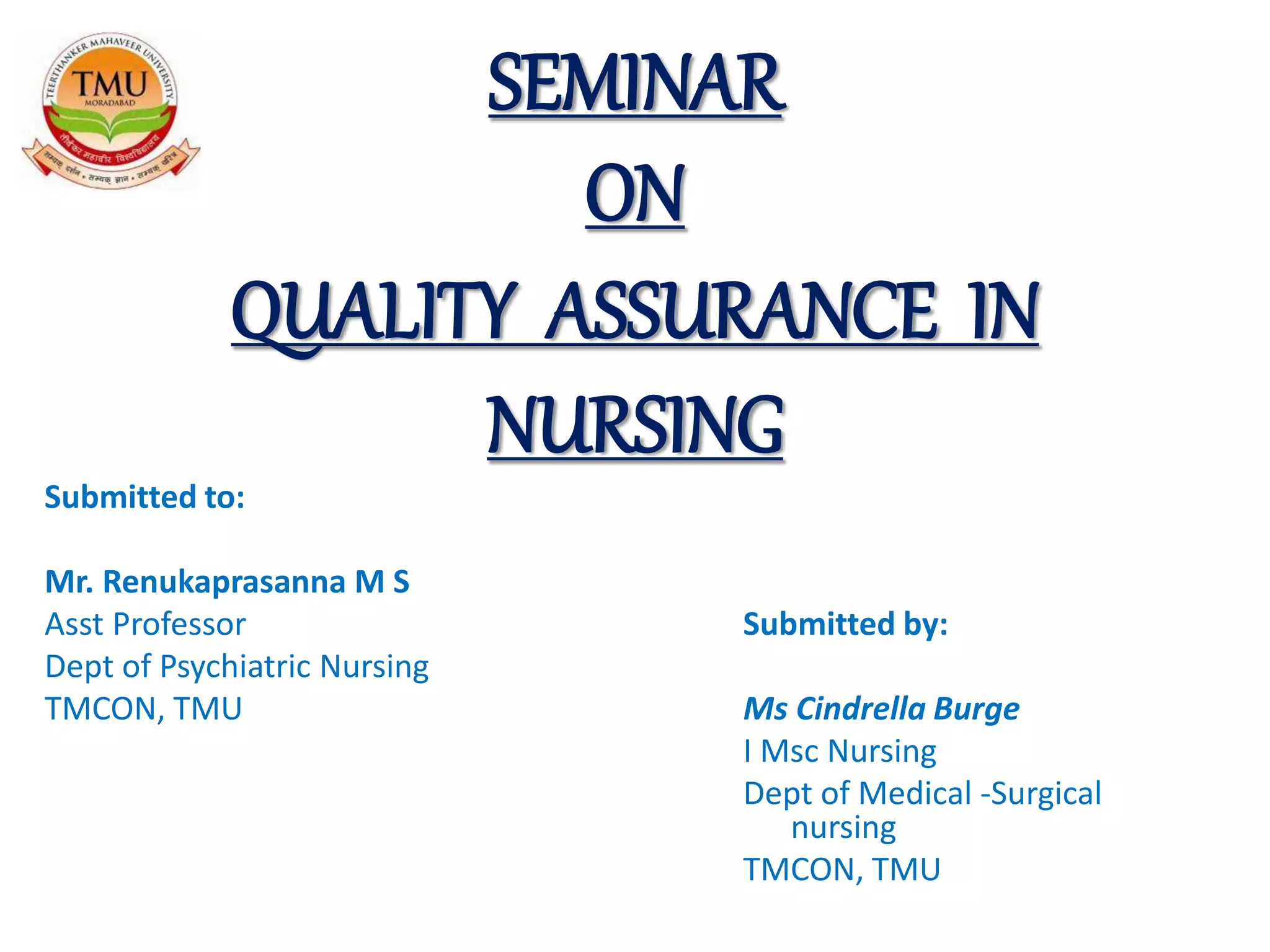 The document discusses quality assurance in nursing. It begins with objectives of defining quality assurance and describing its principles. It then covers terminology related to quality, including definitions of quality assurance, control, and improvement. Models of quality assurance are presented, like the system model and ISO model. Factors affecting quality assurance include a lack of resources and personnel problems. The roles of nurses include maintaining knowledge and ensuring standards are met. Overall, quality assurance aims to ensure nursing practices meet quality standards through compliance monitoring.